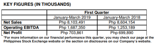 In Q1 2019, sustained public and private construction enabled Holcim Philippines to improve prices for its cement and aggregates offerings. The company also completed expansion project in its La Union plant, which included a tie-in of a new roller press to the finish mill that temporarily affected production volumes for North Luzon. As a result, Company’s revenues dipped by 5.8% year-on-year to Php 8.1 billion.