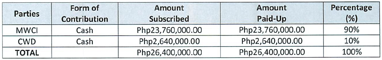 Under the agreement, Manila Water and CWD shall cause the incorporation of a Joint Venture Company (JVC). The company and CWD shall own 90% and 10%, respectively, of the JVC’s outstanding capital stock such that the subscribed and paid-up capital of the JVC shall be as follows: