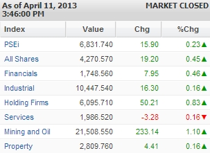 Manila—(PHStocks)—The Philippine stock market maintained their growth Thursday, 11 April, amid continued upbeat market forecasts. The Philippine Stock Exchange (PSE) index gained a slight 0.23% or 15.9 points to close the market at 6,831.74.