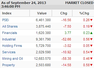 The mainboard Philippine Stock Exchange index (PSEi) declined by 0.26% to 6,461.38, slightly wiping out gains made yesterday.