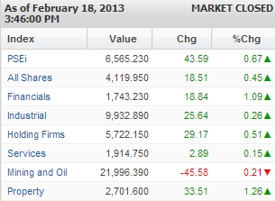 Manila—(PHStocks)—Philippine stocks rallied on Monday as the market enters the earnings report season. Fueled by investors optimism in the fourth quarter and full-year 2012 financial performance of local players, the mainboard Philippine Stock Exchange index (PSEi) made history yet again as it gained 0.67% to close today’s trading at 6,565.23, a new record for the local bourse. The wider All-Shares index, meanwhile, gained 0.45% to close at 4,119.95 as investors across the board try to take advantage of this positive trend.