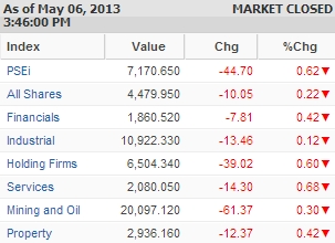 The mainboard Philippine Stock Exchange (PSE) index slid by 0.62% to 7,170.65 on Monday, May 6, but not before hitting a new record intraday high of 7,284.34.