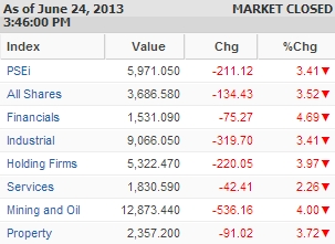 Manila—(PHStocks)—Philippine stocks succumb to sell-off amid continued investor pessimism gripping the market. The benchmark Philippine Stock Exchange (PSE) index dropped by 3.42% or 211.12 points to close today’s trading at 5,971.05 – losing close to 20% of its value since it hit a market high of 7392 in the middle of last month. China’s slide into the bear market territory also weighed in today’s trading.