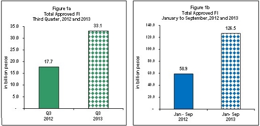 Meanwhile, total approved FI for the first nine months of 2013 reached PhP126.5 billion, increasing by 114.8% from the amount recorded last year at PhP58.9 billion.