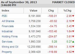 The benchmark Philippine Stock Exchange index (PSEi) plunged by 2.95% or 188 points to close at 6,191.8 today, 30 September, as investors exit the market in light of uncertainties in the U.S. market. Sell-off was heavy, with value turnover reaching PhP36.38 billion on volume of billion.